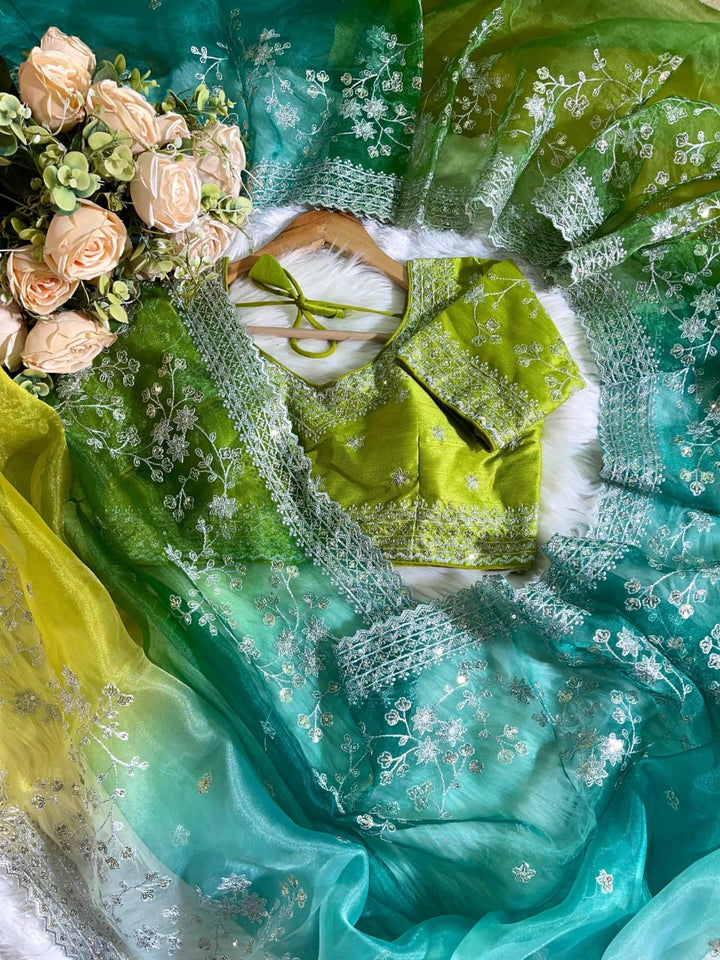 Prism Elegance – Handcrafted Organza Silk Saree with Embroidered Cutwork Border