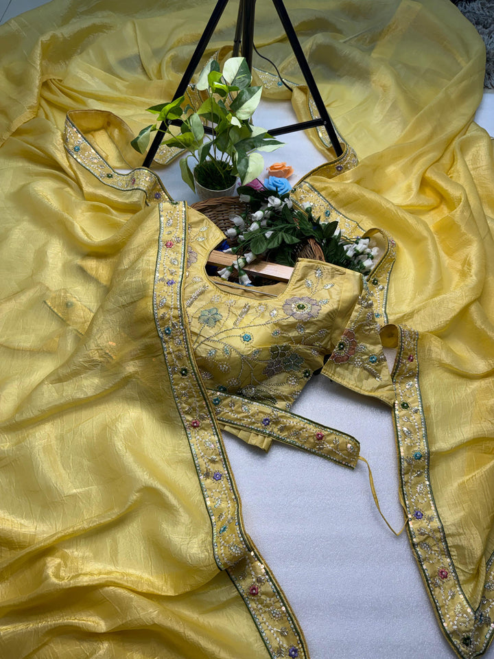 Elevate your ethnic wardrobe with this exquisite designer saree crafted in luxurious Gold Crunchy fabric, known for its rich texture and elegant drape. Intricately embellished with hand-done threadwork, shimmering sequins, and delicate bead embroidery, this saree is a true testament to timeless Indian craftsmanship. The elegant lace border adds a refined finishing touch, making it a perfect choice for festive occasions, weddings, and celebrations.