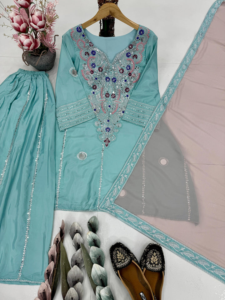This luxurious three-piece suit set features a fully stitched top crafted from heavy natural crepe, exuding a rich drape and timeless appeal. The top is adorned with intricate hand-embroidered sequin work and authentic mirror embellishments, meticulously placed by skilled artisans to reflect light with every movement. A soft micro cotton inner lining ensures all-day comfort without compromising on style.